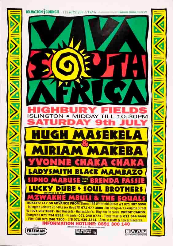There were global celebrations after the 1994 elections. Fitting for the borough that had homed the ANC, Islington Council organised a tribute concert held on nearby Highbury Fields (see above image). Anti- aparthied stalwarts and musicians performed, included Hugh Masekela and Miriam Makeba who headlined.