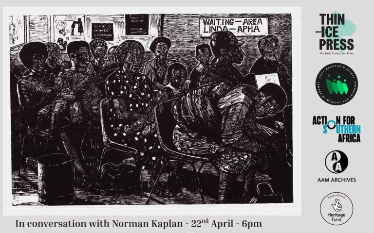 In conversation with Thin Ice Press Director, Helen Smith, Kaplan will reflect on his printmaking practice, process and influences discussing works including The Waiting Room – an evocative print on life in post-apartheid South Africa – alongside his work designing and producing materials for underground ANC and South African Communist Party publications.